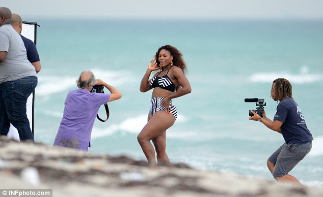 Posing up a storm: Serena Williams shows off her monochrome bikini during a photoshoot in Miami Beach, Florida